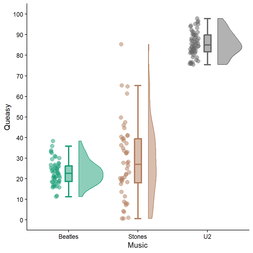 MusiconQueasy: F (2, 157) = 537.67, p < .001 (1). Post-hoc tests showed that the Beatles and Stones groups did not significantly differ from each other, whereas the U2 group recorded significantly higherQueasyscores than both of the other groups (1). We might conclude that listening to 15 minutes of U2 makes one feel more unwell than listening to 15 minutes of either the Beatles or the Rolling Stones (1).