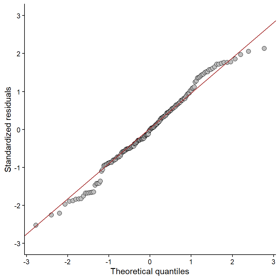 - As can be seen in a QQ plot, the model residuals do not exactly follow a normal distribution (1.5).