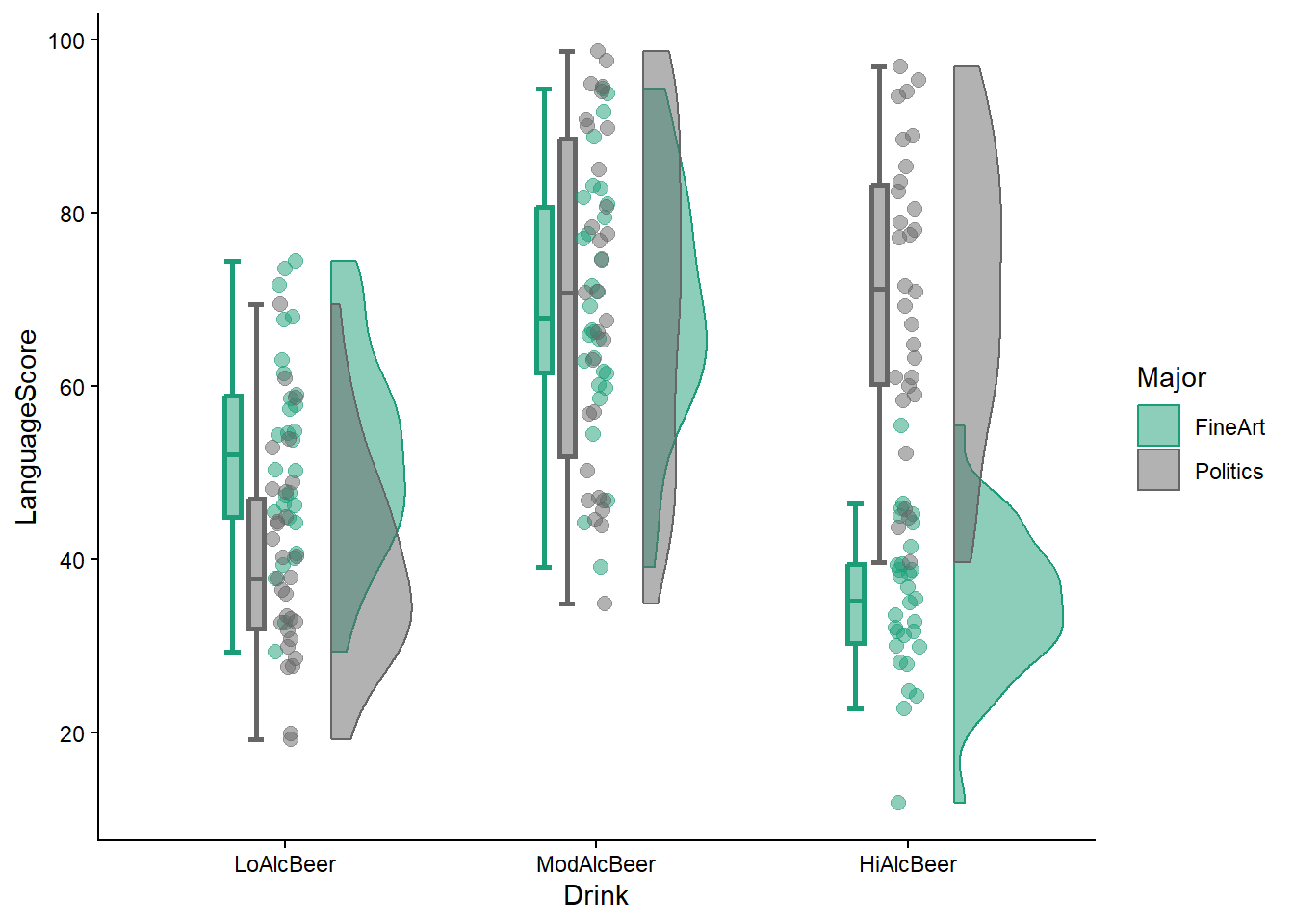 Drinkis significant: ‘standard’-strength beer appears to lead to higher scores than the other categories, followed by strong and low-alcohol beers (1). Post-hoc tests were significant for all categories (1). - The interaction effect is significant: fine Art students’ scores increase across ‘low’ to ‘standard’ beer, but drop across ‘standard’ to ‘strong’; whereas Politics students’ scores increase across ‘low’ to ‘standard and then stabilize/do not differ much across ’standard’ to ‘strong’. The score difference between majors is most pronounced in the ‘strong’ conditions (2). Simple-effects/post-hoc testing shows, when breaking down by