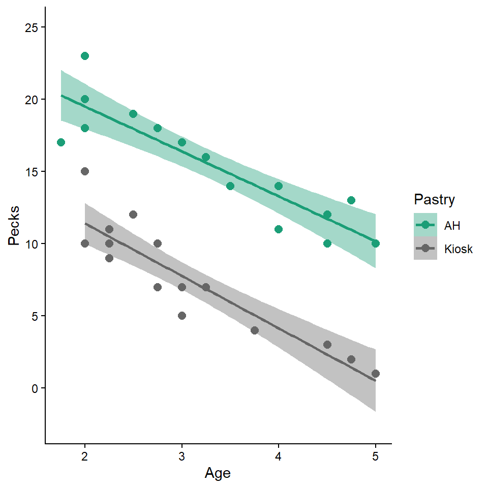 Pastry, adjusted forAge(p < 0.001) (1). On average, when adjusting for age, birds pecked more at the Albert Heijn sausage rolls (mean pecks = 15.47; adjusted mean = 15.86) than those from Kiosk (mean pecks = 7.53; adjusted mean = 7.14). (1 for clear text, 1 for key descriptives)