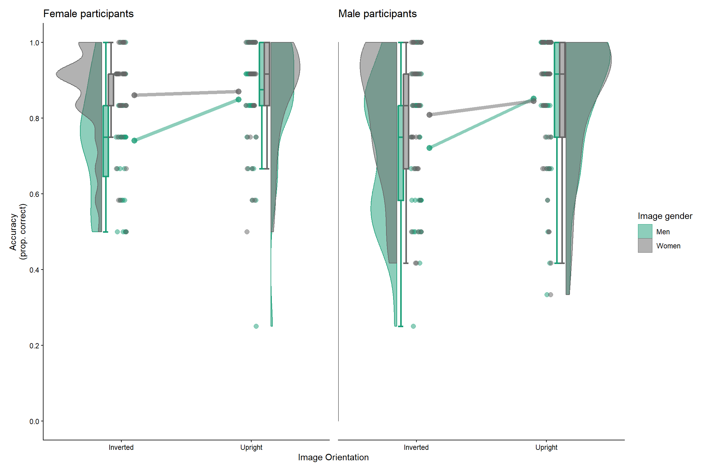 - Significant main effect of inversion (1): overall, recognition scores were higher for upright as compared to inverted images (1).