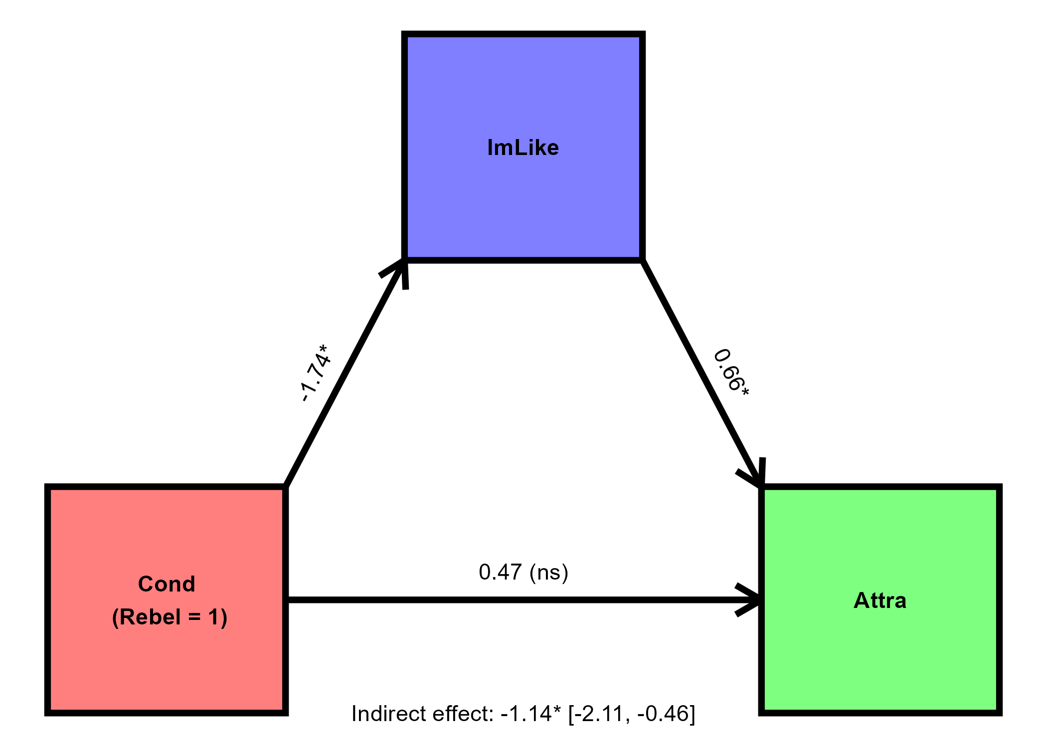 - Condition had no significant direct effect on liking when imagined liking was controlled for (1).